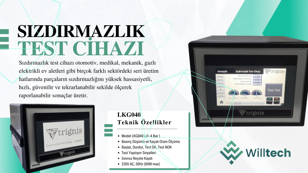 Ambalaj endüstrisinde sızdırmazlık testleri, ürün güvenliği ve kalitesi açısından hayati bir rol oynar. Trignis Teknoloji’nin geliştirdiği sızdırmazlık test cihazları, ambalajların sızdırmazlık özelliklerini titizlikle ölçerek, ürünlerin bozulmasını önler. Willtech Otomasyon olarak bu güvenilir cihazların distribütörlüğünü yapmaktayız.
